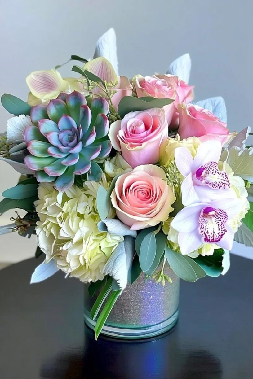 Every element of this floral arrangement is carefully curated to ensure a harmonious balance of colors, textures, and forms. The preserved roses offer enduring beauty, while the hydrangeas and orchids blend seamlessly to create a visually captivating display. The mercury glass cylinder acts as a striking centerpiece, complementing both contemporary and traditional interiors.