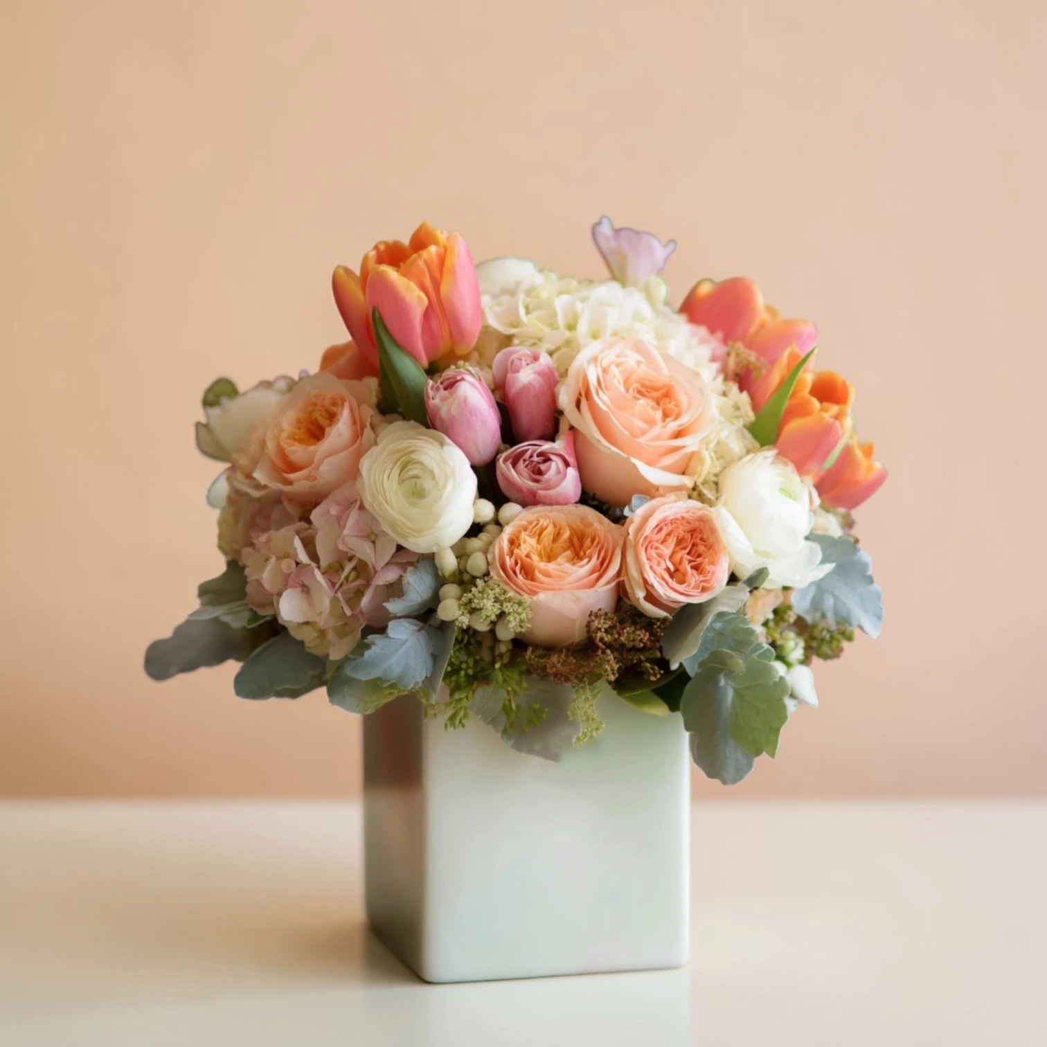 Handcrafted with care, this centerpiece features a harmonious selection of premium seasonal flowers in soft, romantic hues. From delicate pastels to vibrant florals, each stem is carefully chosen to create a balanced and eye-catching palette that radiates charm and sophistication.