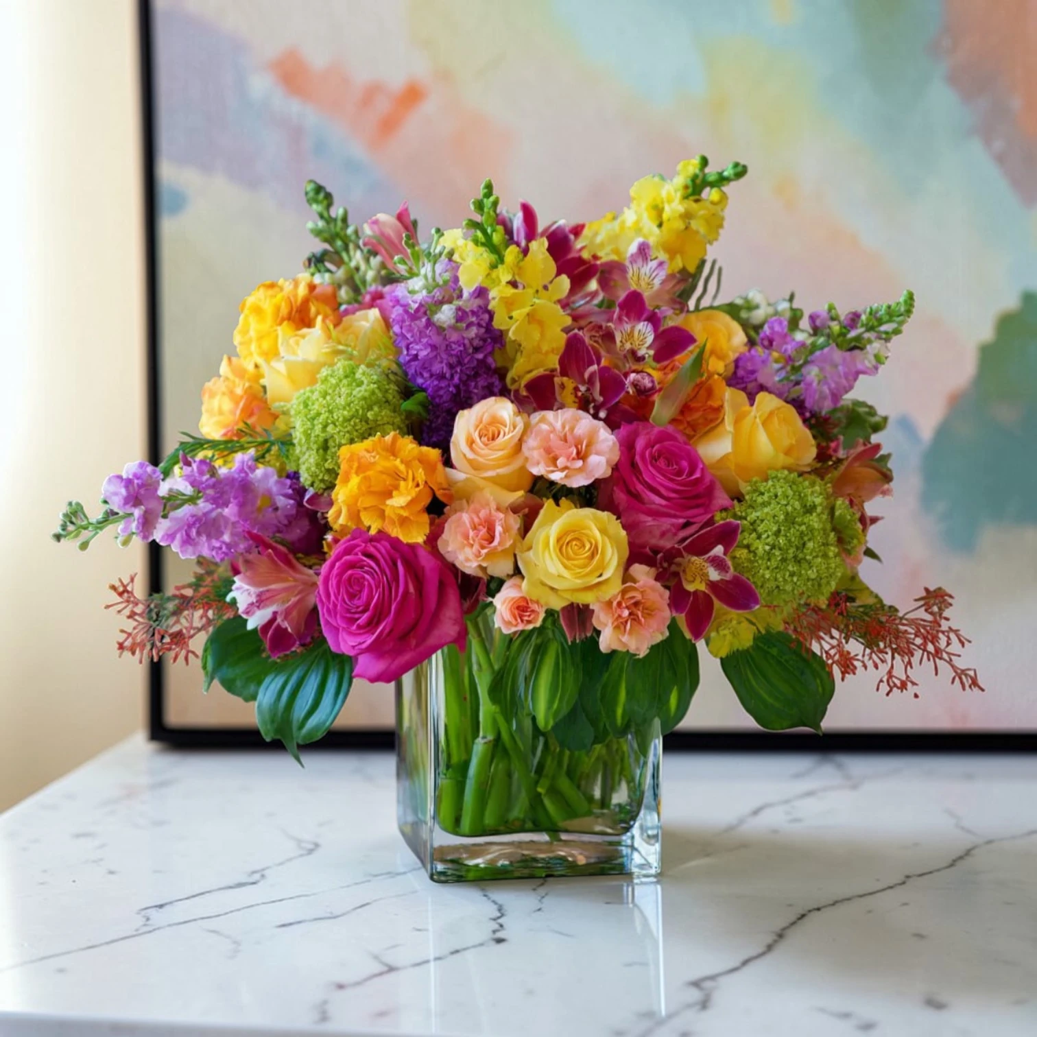 Artfully arranged in a clear square glass vase, this bouquet delivers a dazzling display that is both luxurious and visually captivating. Its refined design ensures a graceful presence, making it the perfect gift or addition to your sophisticated space.